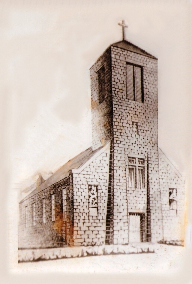 - Fotografia przedstawia kościół zbudowany z kamienia w Koźle przed zburzeniem przez Sowietów. Budowę świątyni z kamienia rozpoczęto w czasie II wojny światowej przy granicy niemiecko-rosyjskiej, która przebiegała przez środek wsi, wzdłuż rzeki Pisy. W 1941 r. niewykończony jeszcze kościół został zburzony. Zbudowano go na nowo dopiero w latach 1978-1990. . Tak powstała parafia pod wezwaniem Najświętszego Serca Jezusowego w Koźle