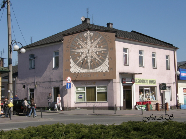 - Zegar słoneczny na fasadzie kamienicy w rynku w Jędrzejowie. Zegar wykonany według obliczeń i projektu Feliksa Przypkowskiego.Przy pilnym przyjrzeniu się mozna odczytac godzinę i zapewniam, że wskazanie jest bardzo dokładne.