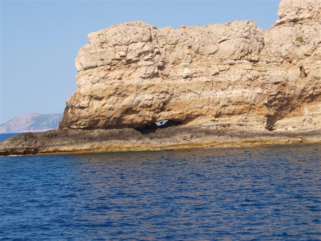 Grecja, Chania. W otworze skalnym ukrył się przed słońcem koziołek
