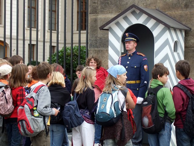 - Gwardzista na Hradczanach w otoczeniu szkolnej wycieczki. Jego wyraz twarzy znaczy więcej niż tysiąc słów ;).