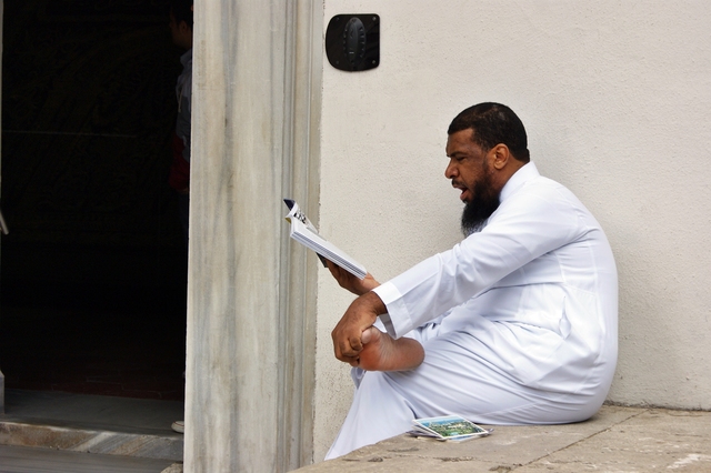 - Muzułmanin siedzący przed pałacem - Topkapi Sarayi. Turcja.