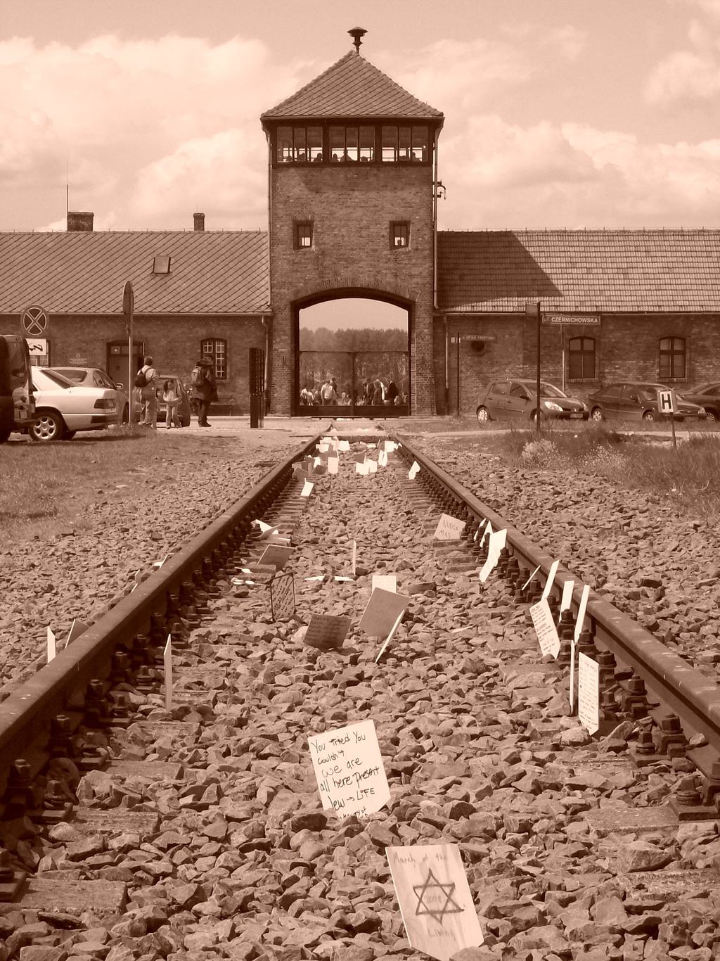 - Brama wjazdowa obozu KL Auschwitz- Birkenau. Na torowisku widać tabliczki ustawione przez uczestników Marszu Żywych